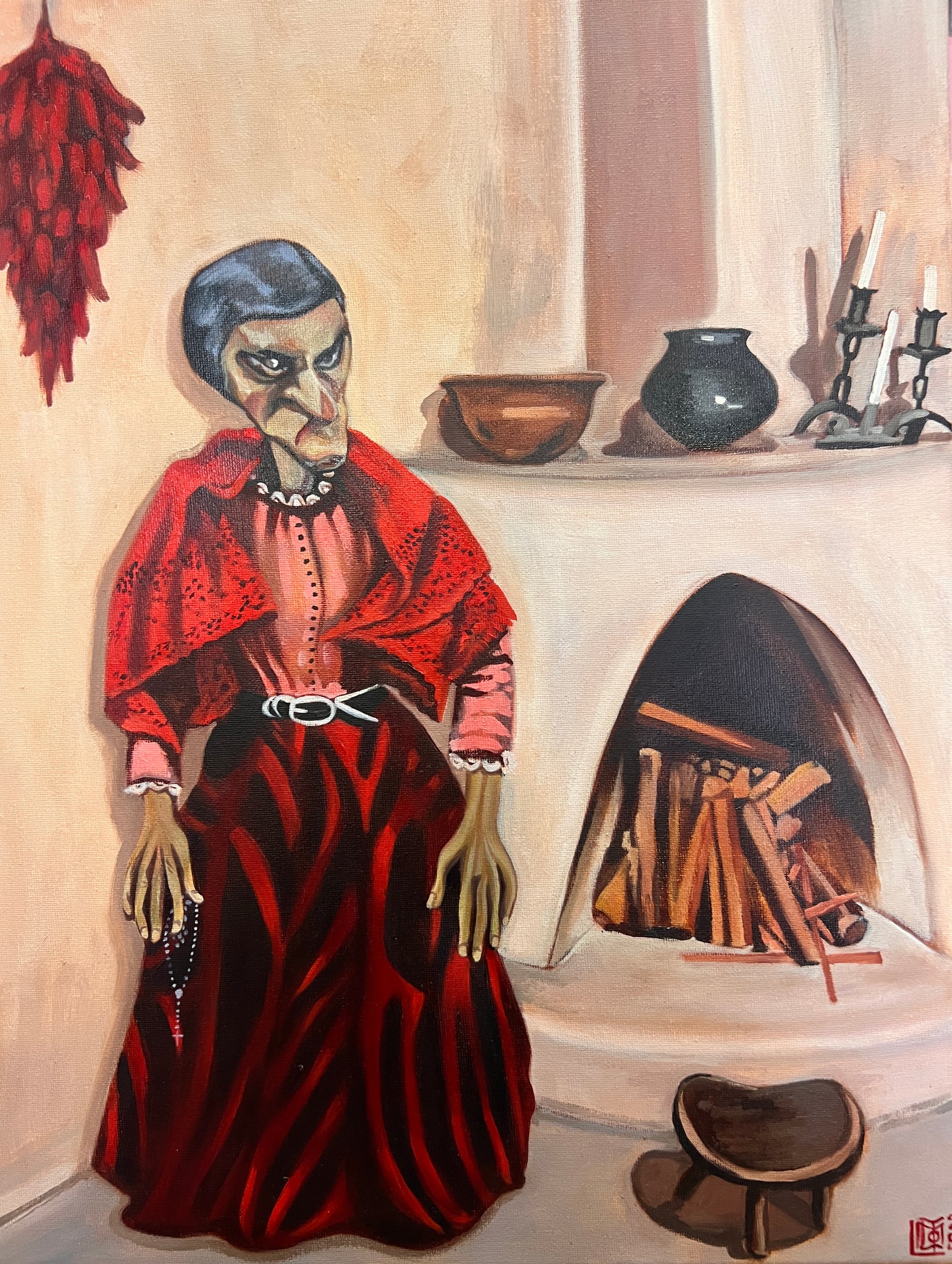This piece is based off a marionette made by Gustavo Baumann that I saw at the @sitesantafe show in June. I put her by a fireplace in the Martinez Hacienda. His marionettes inspired me so much, I would love to make my own someday but I will stick with painting and paper mache for now.